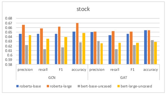 Document embedding is the output feature of using a [CLS] token. Compared with BERT and RoBERTa, it is the feedforward layer that obtains the final prediction. BGSRD is realized by using BERTbase and two layers of GCN. Learning rate initialization 1 × 10 is used for the GCN module, and 1 × 10 is used for fine-tuning the BERT module. Our model is realized mainly by using RoBERTa and GAT (Graphic Attention Network) [38]. Learning edge weights is not based on a predefined weight matrix but on the attention mechanism, especially when GAT variants are trained on the same graph as GCN variants. The input length for setting BERT is 18, 128 is the batch size, and 200 is the dimension of the GCN hidden layer. The number of attention heads of GAT is set as 8 and 0.5 is the default value of dropout. The parameter is updated by using the Adam optimizer.
