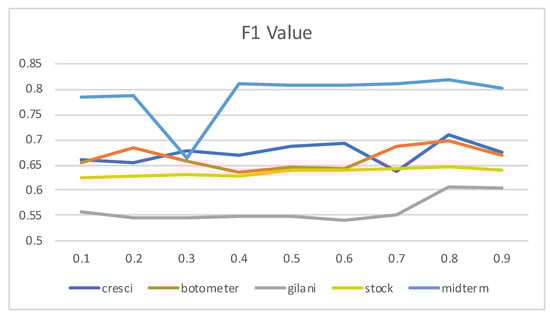 The tradeoff between BGSRD and BERT is trained by control. The optimal value of will be different according to different tasks. The accuracy of RoBERTaGCN with different is mainly shown in Figure 9. The value of F1 is always higher on cresci, and the value of is larger at this time. The explanation for this is the high performance of the graph-based method. When , the model achieves the best performance, which is slightly better than that of using the GCN prediction alone ().