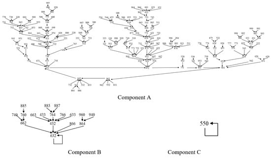 The scheme of parametric transformations can have one or more components. An example can be seen in Scheme 1, corresponding to a 6-digit case with three components. Any component of a scheme is necessarily coalescent and contains a transformation constant (parameters whose image is themselves) or a cycle of 2 or more links. This is due to the uniqueness of the transformation and to the fact that the set of all numerical images is a subset of the multiples of 9 (Section 3). Its cardinal is much smaller than that of the set of reference numbers.