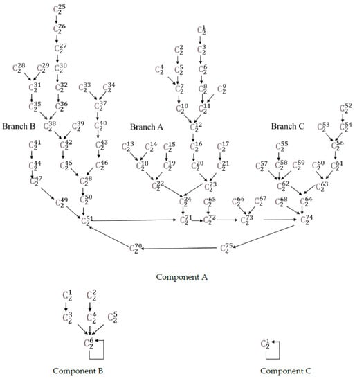 For instance, Table 8 shows the seven classes resulting from u = 13 transformations in component A from A6. As stated several times, component A has a cycle of r = 7 links. Class 661 ⊂ ⊂ and αC1 = 861 ⊂ ⊂ (Table 6). Class 661 needs 14 (2 x r) transformations to become 861—the same number of transformations that needs to reach (Scheme 2) or to reach (Scheme 3). Class 430 only requires r = 7 transformations.