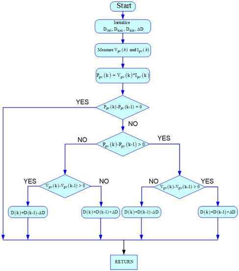 Today, one of the most popular MPPT methods is the P&O method, which has operated for a long time. According to the characteristic curve, the perturbation and observation techniques are applied to adjust the voltage of the photovoltaic system in the direction of constantly increasing power. When the maximum power is reached, the voltage is constantly changing and fluctuating around the maximized power. This algorithm is suitable for slow changes in irradiation and temperature. The disadvantage is an output oscillation on the maximum power. Furthermore, the speed of convergence to a maximized power point depends on the step size (D: delta of duty cycle). The small step size has low oscillations on maximum power and big tracking time. The big step size has high oscillations on maximum power point and low tracking time. A diagram of the perturbation and observation maximized power point tracking (P&O MPPT) method is shown in Figure 3.