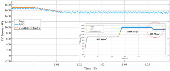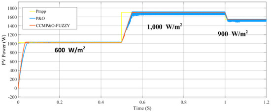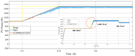 A comparison of the maximum power point tracking between proposed and traditional P&O MPPT methods is shown in Figure 7. The proposed CCMP&O−FLC MPPT method can reduce energy loss more than traditional P&O methods due to less maximum power tracking time.