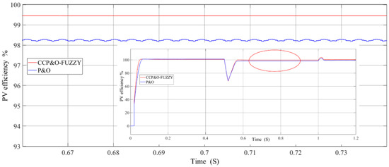 From Figure 11, it can be observed that the efficiency of the PV output of the proposed algorithms is greater than the traditional P&O algorithms. Since there is no oscillation around the maximum power point, the efficiency of the proposed method is higher than that of the traditional method. The power output efficiency of the proposed algorithm is 99.5%.