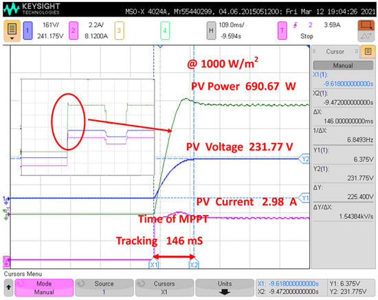 The experimental methods are performed to evaluate and verify the effectiveness of the CCMP&O−FLC MPPT. The prototype circuit used in the experiment and the experiment diagram of the system is shown in Figure 12 and Figure 13, respectively. The specifications are listed in Table 5 and Table 6, respectively. The STM32F4VGA is used to provide the control signal for the boost converter, resistance as load, emulated PV source SM300−10D PV simulator, and SM300−20 programming power supply have been used as a source instead of a PV. The results of the proposed algorithm were then compared with the results of the traditional P&O algorithm. Figure 14 and Figure 15 show the PV output voltage, PV output current, and PV output power obtained by traditional P&O methods corresponding to 600 and 1000 W/m2. Figure 16 and Figure 17 show the PV array output performance of the CCMP&O−FLC method with irradiation 600 and 1000 W/m2. From the experimental results in Figure 14, Figure 15, Figure 16 and Figure 17, we can see that the two MPPT algorithms mentioned in this article are highly accurate. The energy, voltage, and current values obtained by the proposed methods and traditional P&O methods are consistent with radiation levels and theoretically correct. Comparison of the response time of the proposed algorithm with the traditional algorithm showed that the proposed algorithm is approximately 146 milliseconds, the traditional P&O method is around 216 milliseconds, indicating that the proposed method tracks maximum power faster than the traditional one. Figure 15 and Figure 17 show the PV output power of the traditional algorithm and the proposed algorithm at 1000 W/m2. The PV output power of the traditional algorithm and the proposed algorithm are 606.567 W/m2 and 690.67 W/m2, respectively. Since there is a little bit of oscillation around the maximum power point, the efficiency of the proposed method is higher than that of the traditional method. The experimental results of the proposed method are very accurate compared to the traditional method because it has a faster convergence speed and less response time. There is no static vibration around the MPP, which is suitable for real-world conditions.