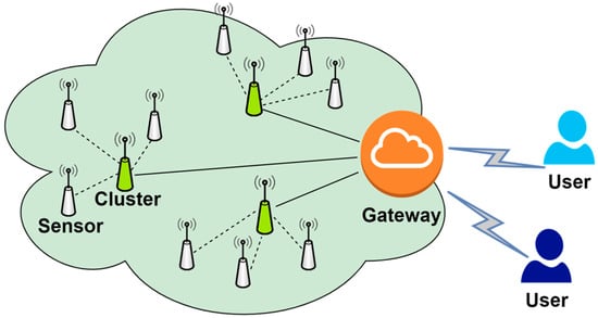 A wireless sensor network (WSN) is a distributed and self-organizing sensor network, which is composed of a large number of sensor nodes that can perceive and understand the external world. In WSNs, sensor nodes cooperate to sense, collect, and process information in the network coverage area and send it to the gateway node. In recent years, WSNs have been widely used in various practical applications in industrial and agricultural fields [1,2,3,4], such as temperature monitoring in agriculture, power consumption monitoring in smart grids, and human health monitoring in medical care. In these application environments, many scattered users, various randomly distributed sensor nodes, and one or more relatively powerful gateway nodes form a powerful network system. For example, in the field of health care, the sensors deployed on the patient’s body can monitor and obtain the patient’s body data, and the medical staff can directly and remotely obtain the patient’s current body temperature, blood pressure, pulse times, and other information in real-time through the wireless sensor network, so as to improve the health status of healthy patients. Figure 1 shows the network architecture of WSNs.