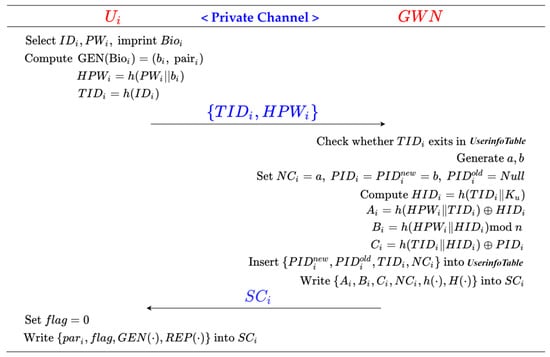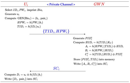 Step 2: The GWN receives and freely chooses . as a pseudonym. Then, the GWN calculates , , , and . Then, the GWN writes into . and stores . Finally, the GWN transmits towards via a private, secure channel.