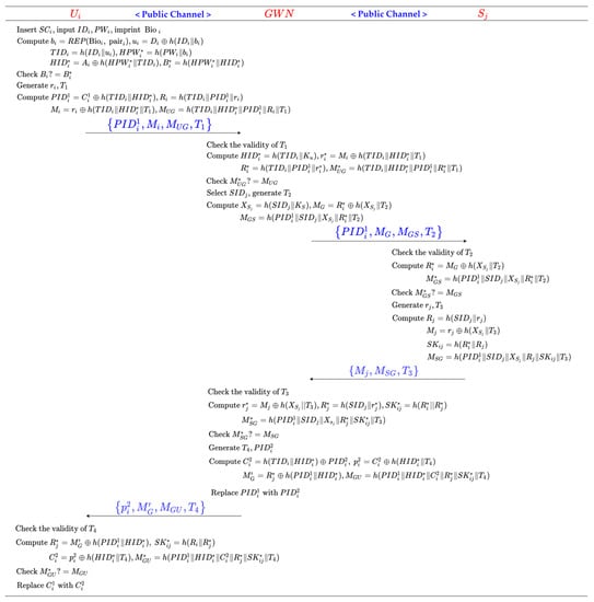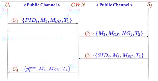 Shin et al.’s protocol consists of four phases: the initialization phase, registration phase, authentication phase, and password update phase. The system completes the selection of parameters and encryption algorithm in the initialization phase. The registration phase realizes user registration and the distribution of smart cards. The authentication phase completes the mutual authentication and session key agreement between the user and the sensor. It should be noted that the communication channel in the authentication phase is public and insecure.