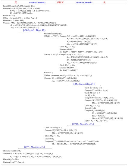 Step 5: Upon the reception of from the GWN, checks whether is a valid timestamp. Then, calculates , , , and . Then, verifies the equality check . If the verification fails, aborts the session. Otherwise, updates , .