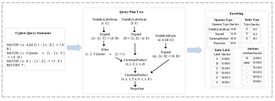 Each query statement can be transformed into a query plan tree composed of operators through the query planner. As shown in Figure 3, for each operator in the query plan tree, we can pre-define the size of the operator’s encoding table according to the Operator Library in the Neo4j database. Then, we can encode operators into a one-hot feature vector. Specifically, we select the operator types, rows, and hits of the query plan tree features to represent the query plan.