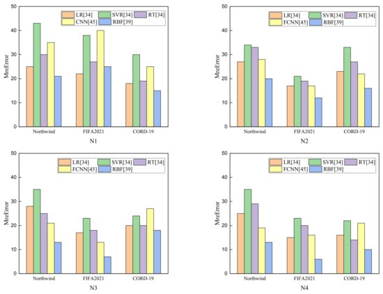 Figure 5 shows the result of the mean relative errors of five models on the three kinds of datasets. Compared with the statistical learning models, the SVR model had the highest mean relative error. Compared to the neural network model, the RBF model’s mean relative error was much lower than that of the FCNN models. In the N1 benchmark, the SVR models had the largest error of 43% in the Northwind dataset; the FCNN and SVR models had a small difference in mean relative error in the FIFA2021 dataset. Additionally, in the CORD-19 dataset, except for the FCNN model, the other model’s error was almost the same. Similarly, the average mean relative error of the RBF model in the Northwind dataset reached 16.5%; in the FIFA2021 dataset, 12%; and in the CORD-19 dataset, 16.25%. The size and complexity of an experiment’s datasets can affect the query performance prediction. With respect to the difference between the Northwind dataset and the CORD-19 dataset, the former has five types of nodes and four types of relationships, and the latter has three types of nodes and two types of relationships. Additionally, the FIFA dataset’s underlying data are the simplest; the corresponding query category variables are also less than those of the other datasets. Additionally, the prediction models can also directly affect the results predicted.