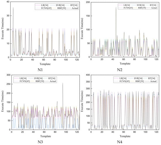 Figure 6 shows a comparison between the predicted execution time and the actual execution time of the five models for four benchmarks on the Northwind dataset. In the N1, N2, and N3 benchmarks, we found that several actual values were much larger or much smaller than other actual values due to the influence of the database system (e.g., network bandwidth, CPU and I/O utilization, etc.). In Figure 6, there is a large error between the predicted value and the actual value of the SVR model. In contrast, this situation did not appear for other benchmarks; we will explore the main reasons for this in future work. Additionally, we also found that the predicted value of all the samples fluctuated with the fluctuation of the true value; thus, the accuracy and effectiveness of the prediction models are further verified. As shown in Figure 6, the predicted value of all the templates fluctuated, followed by the actual value, verifying the effectiveness of the five prediction models. The results for the FIFA2021 dataset and CORD-19 dataset are omitted for space considerations.