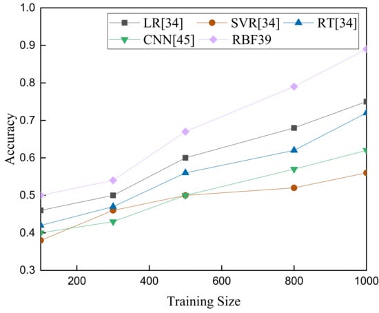 The accuracy of training size in five types of prediction models: LR [], SVR [], RT [], FCNN [], and RBF [].
