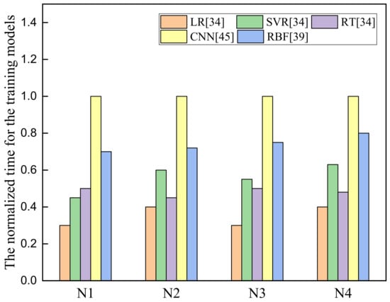The normalized time of training for the five types of prediction models: LR [], SVR [], RT [], FCNN [], and RBF [].