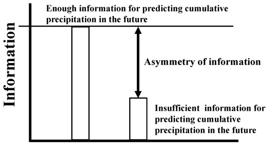 Decision-makers are not sufficiently skilled to predict the future [12], thus making appropriate decision-making regarding the future impossible. Akerlof [13] proposed the concept of asymmetry of information [9], in which one group has more information than another. A group with less information cannot make decisions accurately and rationally, owing to the lack of information necessary for predicting the future. This situation corresponds to an asymmetry of information between the information available to predict the future and the information necessary for predicting the future accurately and rationally (Figure 1). Decisions or behaviors under uncertainty, such as evacuation due to flooding, are likely to be vulnerable to cognitive biases (irrational behavior decisions) [11,14,15] because of the increases in the asymmetry of information caused by uncertainty. Under uncertainty, during outbreaks of natural disasters, asymmetry of information hinders accurate prediction of the future and rational decision-making. The worst case would result in many disaster victims.