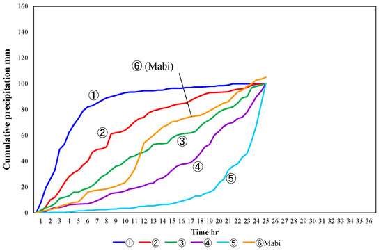 Assumed patterns and actual data (Mabi town in Kurashiki city) for cumulative precipitation in the past 24 h.