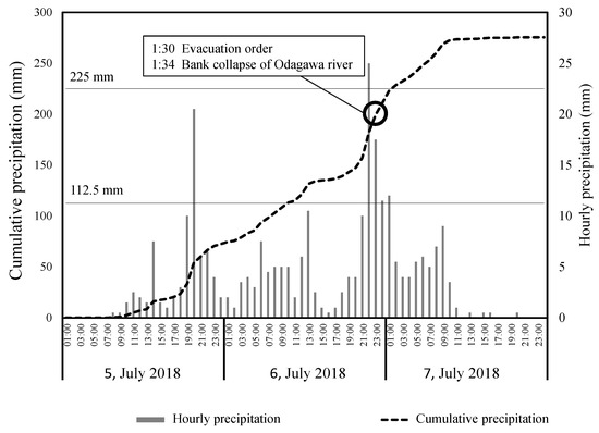 Torrential rain fell on western Japan from 6 to 7 July 2018 and induced extensive damage around this area, particularly in the Hiroshima, Okayama, and Ehime prefectures [4,5,6,7,8]. Many people were victims of this disaster, and 51 people were affected by the flooding in Mabi town, Kurashiki city. The hazard map of Kurashiki city indicated a risk that cumulative precipitation above 225 mm over 2 days would lead to the collapse of the riverbank along the Odagawa river and a subsequent flooding disaster. However, Kurashiki city officially issued evacuation orders 4 min before the collapse of the riverbank along the Odagawa river, thus resulting in delayed evacuation for many residents. Members of the self-defense force and police rescued approximately 2350 people [9,10]. Unfortunately, appropriate and rational evacuation orders were not issued.