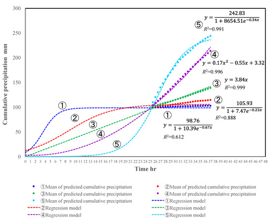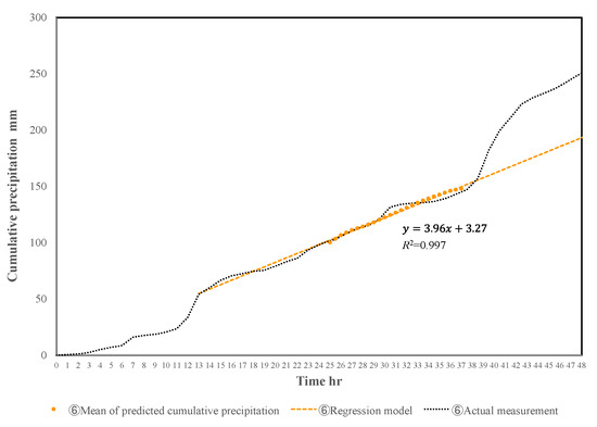 Figure 4 shows the geometric mean of the predicted cumulative precipitation across all participants for the five assumed patterns in Figure 2. In Figure 4, the results of the prediction of cumulative precipitation over the next 12 h, using mathematical models, are also depicted. As shown in this figure, the prediction by participants corresponded well with that by mathematical models. Figure 5 shows a similar result to the data in Figure 3. Linear regression analysis was conducted on the predicted cumulative precipitation across all participants for the five assumed patterns in Figure 2 and one actual pattern in Mabi town in Figure 3. Figure 5 also shows a result for the prediction of cumulative precipitation over the next 12 h using a mathematical model. It must be noted that the mathematical model was applied to the data after 12 h. Even for the actual data of Mabi town, Kurashiki city, the prediction by participants corresponded well with that by a mathematical model. The prediction using past time series could not predict the future cumulative precipitation accurately after 37 h, as shown in Figure 5. The slopes of a simple linear regression for patterns ①–⑥ were 0.27, 1.29, 3.25, 9.67, 11.75, and 4.01, respectively. For the convergence pattern (①) and pattern ②, the slopes tended to be smaller. As the pattern changed from ① (convergence) to ⑤ (divergence), the slopes increased. The slopes of data based on the actual pattern for Mabi town (⑥) were slightly greater than those of pattern ③. In summary, the prediction results provided by participants were not far from those of mathematical models.