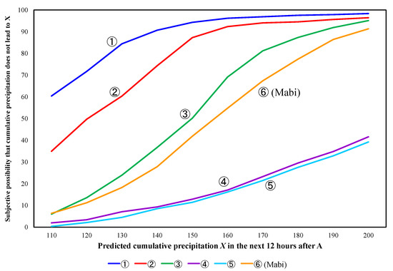 Subjective possibility of cumulative precipitation not exceeding X, compared among Xs for the five assumed patterns and the data for Mabi town, Kurashiki city, 5–7 July 2018.