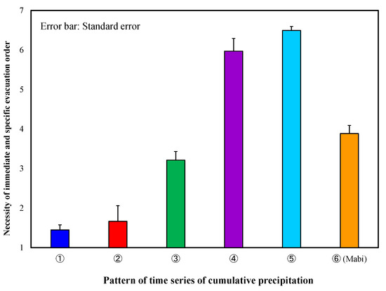 As clearly shown in Figure 5, the predicted cumulative precipitation corresponded well with the actual cumulative precipitation. As shown in Figure 6, Y (the subjective possibility for each participant that cumulative precipitation would not lead to X) compared among conditions of X in the convergence pattern (①) and pattern ② was overestimated. The similar subjective possibility for each participant indicated that the cumulative precipitation in the divergence pattern (⑤) and pattern ④ had relatively lower values. Participants tended to overestimate the subjective possibility with respect to the actual data for the Kurashiki flooding disaster (Mabi town). The value of Y (the subjective possibility that cumulative precipitation would not lead to X) was 91.54, thus suggesting that the participants underestimated the risk of riverbank flooding and optimistically felt that the cumulative precipitation would not reach a hazardous level (X = 200 mm). This finding was further supported by the data shown in Figure 7, because the necessity of immediate and specific evacuation orders for the actual time series of cumulative precipitation (Figure 3) was 3.88, a value lower than those of patterns ⑤ and ④.
