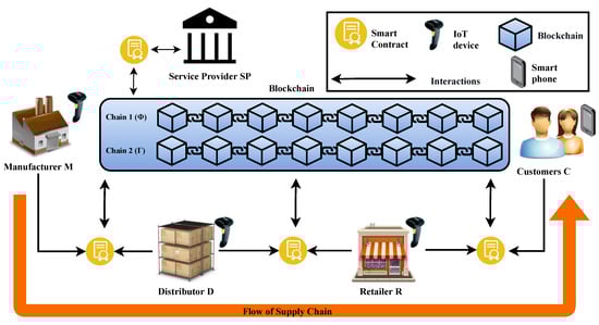 Formally, the proposed system in Figure 2 consist of n number of Manufacturer , Distributor , Retailer , Customer , and Service Provider . Each , and will have n number of IoT devices, which is , and , respectively. Participants , , , and perform their task by executing protocols and . Protocol and are used for registration and authentication process, respectively. These protocols can make sure privacy, security, and authenticity of the participants, which is described in Section 5.