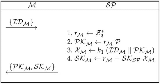 This section only focuses on the system setup. Here, selects an elliptic curve , where is a finite field, which is decided by prime p. It also selects a generator on the curve with order q and a master or secret key . It publishes the public key , , p, q, where and . Here, is a multiplicative group of integers modulo q.