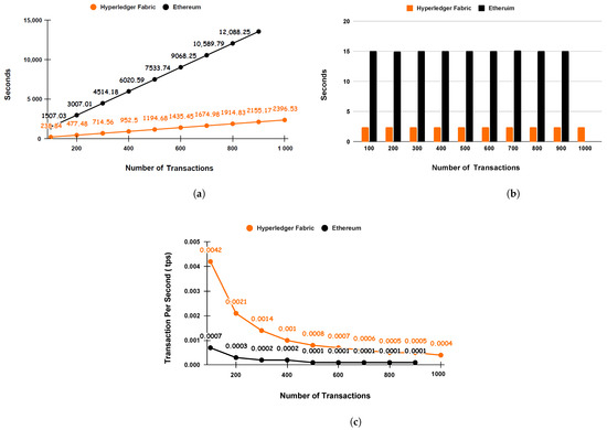 Performance analysis of Hyperledger Fabric and Ethereum. (a) represents the execution time where the x-axis shows the number of transactions and the y-axis shows the time in seconds for each group of transactions. (b) represents the average latency where the x-axis presents the number of transactions, and the y-axis presents the time in seconds for each set of transactions, and (c) represents the average throughput where the x-axis holds the number of transactions, and the y-axis holds the number of transaction per second (tps)) for each set of transactions. (a) Execution time; (b) Average latency; (c) Average throughput.
