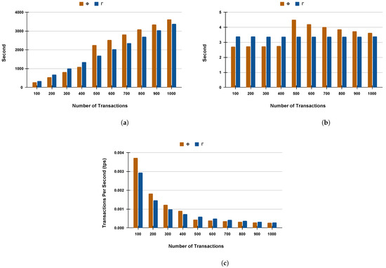 We investigate the execution time of two protocols (i.e., and ) by the number of transactions in Figure 7a with Hyperledger Fabric. The x-axis illustrates transactions counts (varying from 1 to 1000) and the y-axis indicates an individual group’s transaction time. The execution time is proportional to the transaction count on a linear scale. The result analysis of this study shows that Hyperledger Fabric’s execution time is quite practical. When the number of transactions is 100, then the protocol takes 268.55811 s and the protocol takes 339.351912 s. When the number of transactions is 500, then the protocol takes 2258.245325 s and the protocol takes 1687.087315 s. When the number of transactions is 1000, then the protocol takes 3626.718443 s and the protocol takes 3386.043616 s. It is clear from the above Figure 7a that protocol consumes much more time than protocol as the transaction number increases.