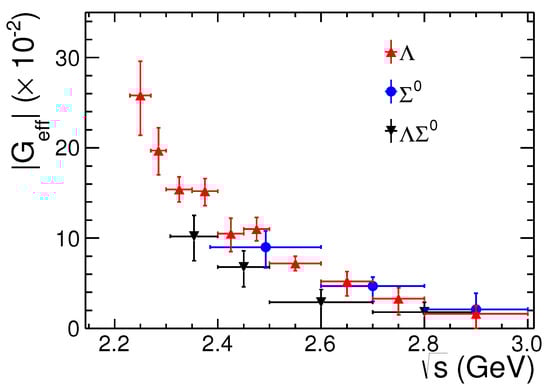 Near production threshold of pairs, the cross section were observed to be pb and pb, which disagrees with the pointlike expectations close to threshold of pb. The cross section lineshapes presented in Figure 3 for and are well-described by pQCD-motivated functions. The ratio of the to was found to be , which is inconsistent with predictions from several models [,,,,,,,]. The EFF is proportional to the square root of the cross section, and the observed ratio of was found to be consistent with 3, which is the ratio of the incoherent sum of the squared charges of valence quarks in and baryons, , with . Furthermore, the EMFF ratio of the was reported through an angular analysis at three high-statistics energy points, and GeV for . The study based on the polar angular distribution of , the ratio of the baryon was determined to be near threshold as shown in Figure 4, which is significantly higher than 1 []. The ratio of the shows similar features to that of other baryons like proton [,,], [,], and [], which are all bigger than 1 within uncertainties near production threshold and consistent with 1 at higher-s.
