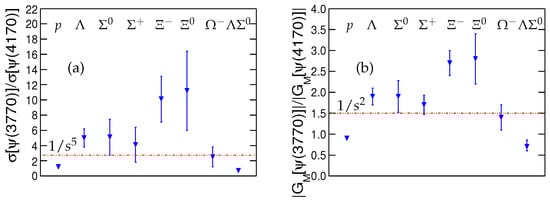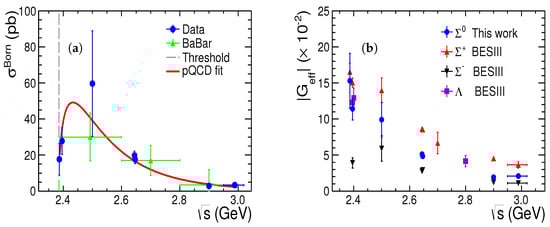 (a) Comparison plot of the cross sections for reaction. The triangles in green are results from BaBar []. The solid line in red shows the pQCD fit. (b) Comparison plot of the EFFs of hyperons from BESIII results [,,].