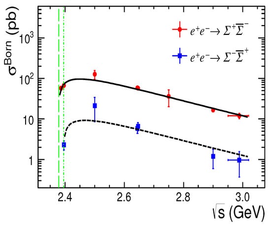 - Ablikim, M.; Achasov, M.N.; Adlarson, P.; Ahmed, S.; Albrecht, M.; Amoroso, A.; An, Q.; Bai, Y.; Bakina, O.; Baldini Ferroli, R.; et al. Measurements of Σ+ and Σ- timelike electromagnetic form factors for center-of-mass energies from 2.3864 to 3.0200 GeV. Phys. Lett. B 2021, 814, 136110. [Google Scholar] [CrossRef]