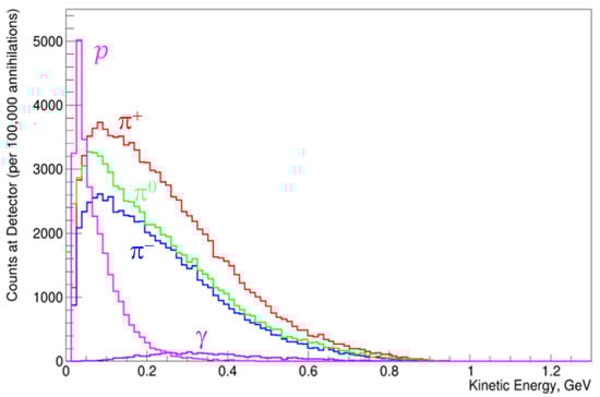 The distribution of the final state kinetic energies of outgoing annihilation-generated particles. In red, are shown; in green, ; blue is ; pink shows protons, p; and purple shows photons, , resulting from certain heavy resonance decays.