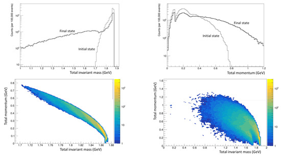 The initial and final state distributions of invariant mass (top left), the absolute value of the total momentum (top right), the relationship between the total momentum and invariant mass for the initial (bottom left) and final (bottom right) states.