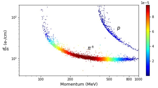 The expected mean energy loss in the TPC, , for simulated pions and protons.
