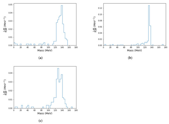 Distribution of the diphoton mass for simulated events containing a single neutral pion using (a) the true energies of the photons and the geometrically determined angle between them, (b) the deposited energy and the true angle, and (c) and the deposited energy and the geometrically determined angle.