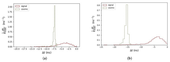 Timing quantity, , for signal and cosmic muon background for the HIBEAM (a) and NNBAR (b) detectors.