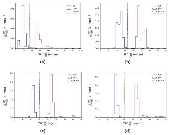 Expected distributions of the mean rate of energy loss, , for protons (orange) and pions (blue), for different ranges in scintillator layers for the particles. The selection windows for are also shown - selected pions (protons) correspond to the region to the left (right) of the dashed vertical line. The scintillator ranges are (a) layer 1; (b) layer 5; (c) layer 7; (d) layer 10.