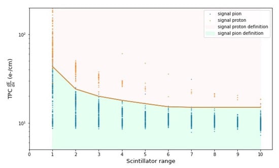 The expected mean rate of energy loss, , for protons and pions in the TPC, shown for the range in scintillator layers for each particle.