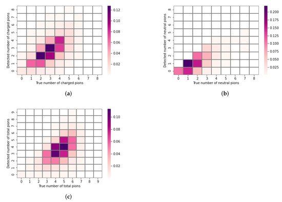 True and detector-level multiplicities for (a) charged, (b) neutral and (c) all pions.