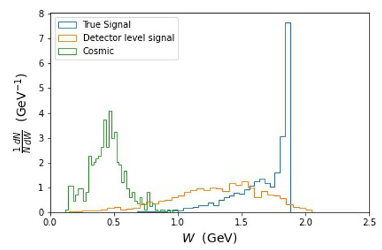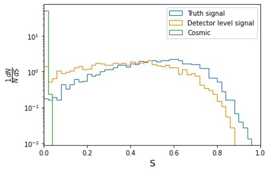 Figure 14 shows the analogous distribution of sphericity for true signal events and detector-level signal and cosmic muon background events. As expected, the pure cosmic ray events have small values of sphericity, while signal events have larger sphericity. The discrepancy between true and detector-level sphericity arises due to the same factors as for the invariant mass variable.