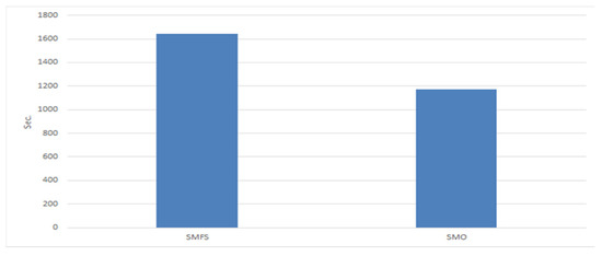 Figure 4 shows that the proposed model improves the composition time. The results presented in Figure 4 confirm that the time needed by the SMFS technique during the construction of the composition services is longer than the time needed by the proposed model using SMO. The composition time required by the SMFS is 1645.71 s, while the time necessary to complete the composition process by the SMO proposed model is 1172.03 s.