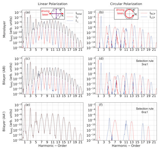 - Le Breton, G.; Rubio, A.; Tancogne-Dejean, N. High-Harmonic Generation from Few-Layer Hexagonal Boron Nitride: Evolution from Monolayer to Bulk Response. Phys. Rev. B 2018, 98, 165308. [Google Scholar] [CrossRef] [Green Version]