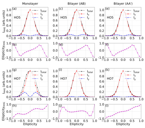 - Tancogne-Dejean, N.; Mücke, O.D.; Kärtner, F.X.; Rubio, A. Ellipticity Dependence of High-Harmonic Generation in Solids Originating from Coupled Intraband and Interband Dynamics. Nat. Commun. 2017, 8, 745. [Google Scholar] [CrossRef]