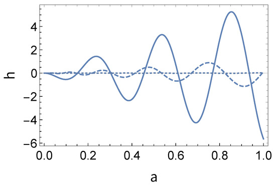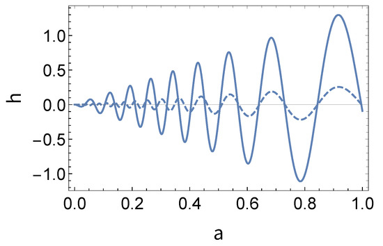 For the other possible solutions for the background in unimodular gravity (with or ), it seems impossible to obtain a closed expression for h. However, we can integrate numerically. First, we do it in a qualitative way rewriting Equation (37) for the scale factor. The result is
