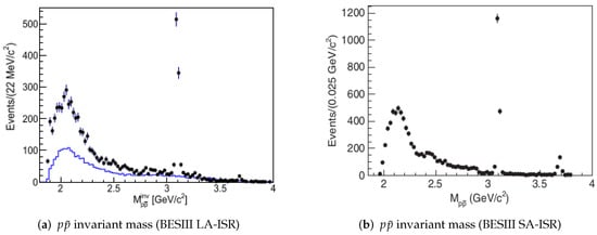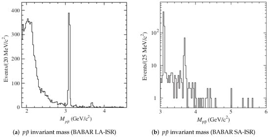 The BABAR experiment started to take physics data in October 1999 and completed data taking in April 2008. Analyses through the ISR process were performed for the full data (BABAR experiment has performed the LA-ISR analysis with half of luminosity, 232 fb, in 2006 [15]. In this report, the results from BABAR LA-ISR analysis with the full data sets [16] are reviewed) with an integrated luminosity of 469 fb, which were collected at a c.m. energy of 10.58 GeV () and 10.54 GeV for about 90% and 10%, respectively [16,17]. Depending on whether the ISR photon is detected within the detection volume or escapes through the beam pipes, the analyses are referred to as LA-ISR or SA-ISR, respectively. The event selection for both types of analyses requires that two charged tracks originating from the interaction region are detected and identified as a proton or antiproton. For the LA-ISR analysis, additional photons have to be reconstructed in the events and a four-momentum kinematic fit is applied for the proton, antiproton and most-energetic photon. For the SA-ISR analysis, a requirement on transverse momentum is applied to remove the LA-ISR events and to suppress the background events. Figure 3 shows the invariant mass distribution from the LA-ISR and SA-ISR analyses.