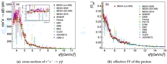 The effective form factor of the proton is extracted from the cross section measurements for both LA- and SA-ISR analyses at BABAR and BESIII experiments according to Equations (2) and (3). Figure 5 shows the results for the cross section (Figure 5a) and the proton effective FF (Figure 5b) from all the analyses with the ISR process at BABAR and BESIII experiments, together with other available experimental data from the direct annihilation process.