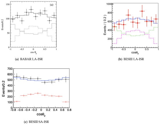 Taking advantage of the strong boost of the ISR photon, a full angular distribution of the proton can be obtained from the process. This is in contrast to most analyses using the direct annihilation process, which has to limit the angular range due to detector acceptance. Therefore, the ISR method allows the extraction of the ratio of the proton FFs () with a relatively higher precision compared to that of direct annihilation measurements with comparable statistics. Both LA-ISR analyses from BABAR and BESIII measured the ratio of the proton FFs at the invariant mass region of threshold −3.0 GeV/c for six mass intervals, while the BESIII SA-ISR analysis measured the ratio between 2.0–3.0 GeV/c for three mass intervals with reduced proton angular distributions. Figure 6 shows examples of proton angular distributions including a fit to extract the ratio of the proton FFs [16,20,21].