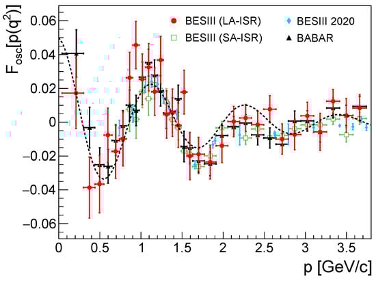 In 2015, Bianconi and Tomasi-Gustafsson studied the proton effective FF from BABAR LA-ISR measurement, and found the data can be best reproduced by a three-pole function () with an additional periodic oscillation part () [56,57]. By including more experimental data from BESIII (direct annihilation and SA-ISR analyses) and CMD-3 experiments, this research was updated in 2021 [48].