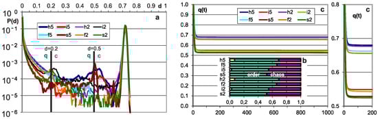 The main result, however, is a “degree of order” q—a fraction of damage after small perturbations, which build the left peak of P(d). This represents the probability of acceptance (lack of elimination) of changes in the modeled evolution. Such damage fits into the range of the “small change” of the functioning while it is measured at the time tmx. It is summarized in Figure 1b. A sufficient size of q is the base in which we found half-chaos in the range of chaotic parameters.
