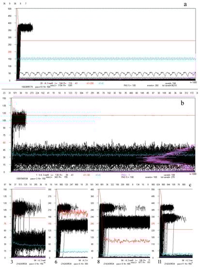 For the purity and simplicity of acceptance and accumulation criteria, a rule has been introduced that the process that has returned under the threshold is still counted, and its counting ceases after 70 steps since the last transition over the threshold. This caused a large part of such processes, even with A3 over the threshold, to be counted for a long time, even to the end (Figure 4c,d).