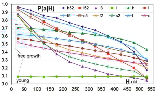 Tendency of conservation of old nodes. Horizontal axis H-intervals of the sequence of the connection of the nodes corresponding to the “depth of history” and the “age” of the node. The 50 youngest among those currently presented, joined in the last order, constitute the range 0–50, and the oldest 50 among the currently presented range of 500–550. In the picture, networks h and i with thresholds 0.5 N and with 0.2 N have such similar P(a|H) values that they are summarized and shown as one line. Here, additional network type l is shown because it gives an especially important result. ‘l3′ is ‘l’ calculated with the threshold 0.2 N (l was not calculated with 0.5 N); however; in the wider report of these investigations [5], ′l2′ and ′l3′ are reserved and it is better to not make deviations from it. Network type l3 has fixed k = K = 3. All networks show a clear relationship—for older nodes, acceptance of removal is less probable. Networks indicated as l, h, f, s (without digit) have grown freely—without condition. Network l with fixed k does not show the dependence of the probability of removal acceptance from the age of the node, whereas the networks f, s, h, i show such a relationship, although it is weaker than for conditional growth. This suggests that the decrease in the chances of accepting the removal connected to the age of a node in network l3 growing with the accumulation condition results from this condition, and for the f, s, h, and i networks, it also results from the increase in the degree of k (number of outputs). For network type l, which for random growth does not show dependence, the relationship for l3 is a demonstration of the tendency of conservativeness of older nodes. For the other networks, this tendency is seen in the increase in slope of conditional growth relative to free growth. Formally, dependence on the node age of the free growing networks is not a tendency (in a sense, defined in [19,20,23]), because it does not result from the condition of accumulation.